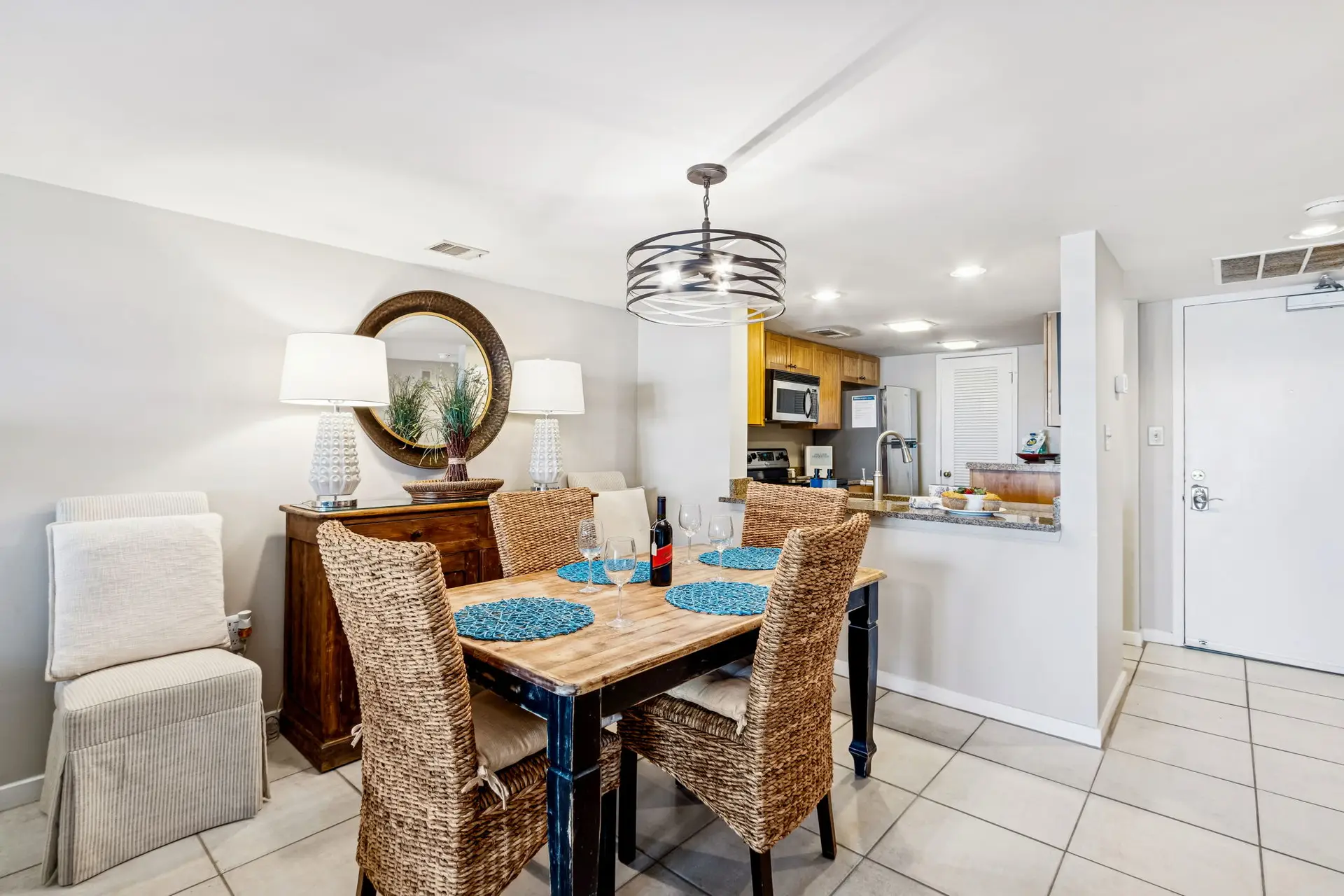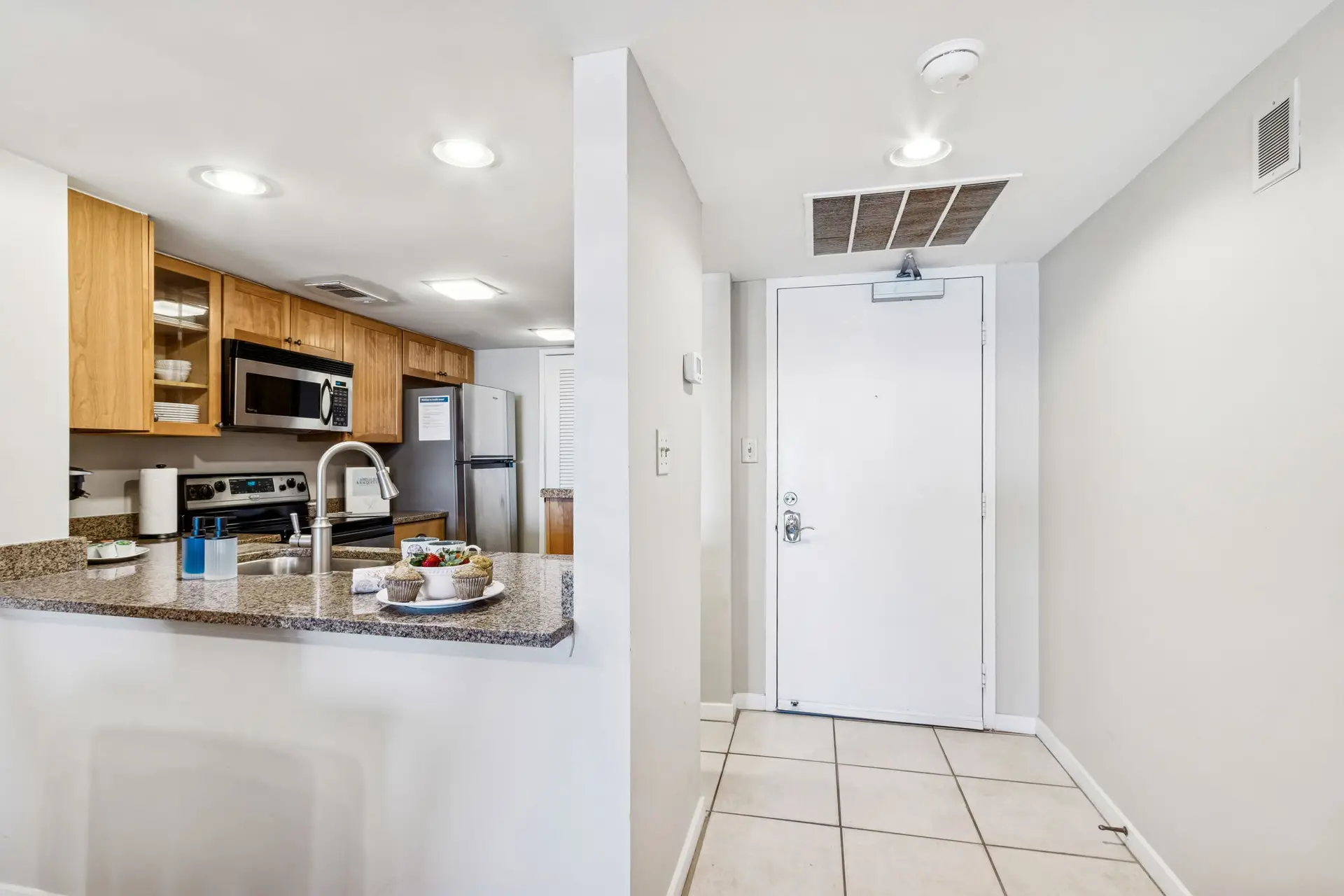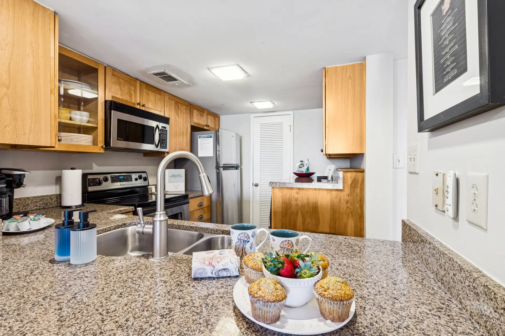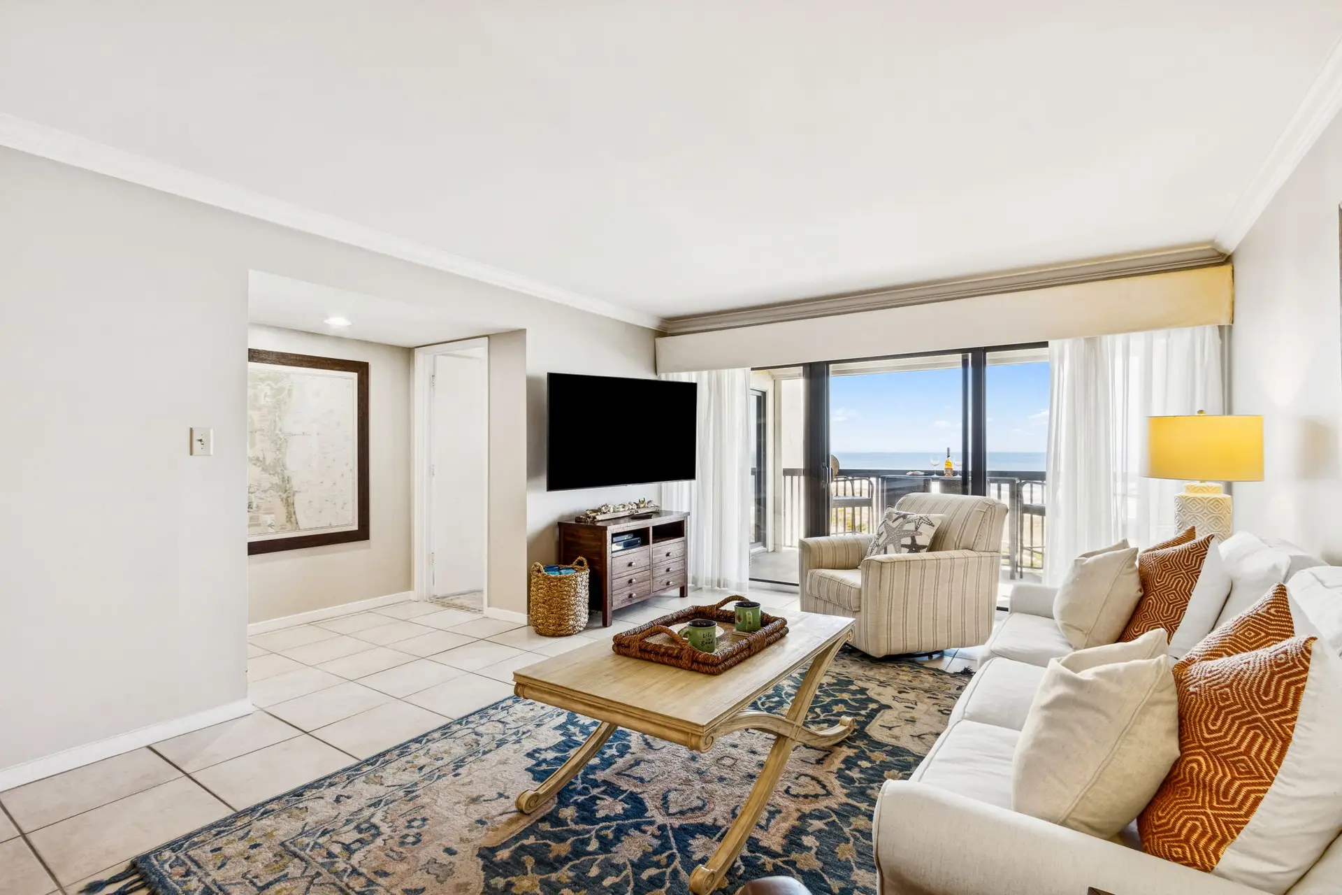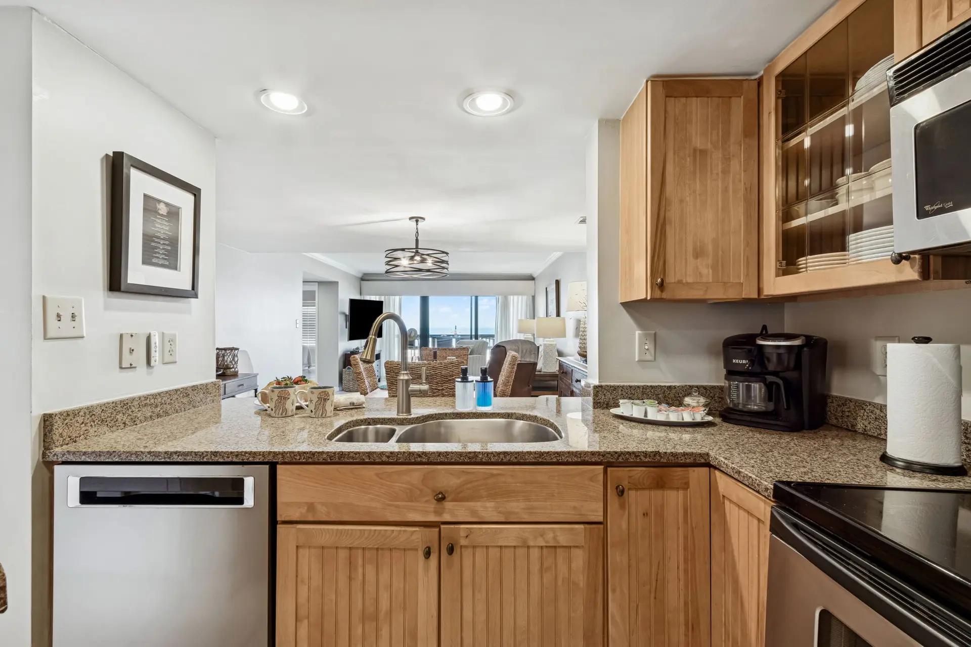 Inside, the condo combines modern comforts with a classic coastal style. The open living area has plenty of natural light and includes a pullout sofa for additional guests. Floor-to-ceiling sliders frame the ocean beyond, creating a seamless connection between the living space and balcony. A dining table sits just off the living area, while the adjacent kitchen with warm wood cabinetry comes stocked with the essentials you’ll need for your stay.