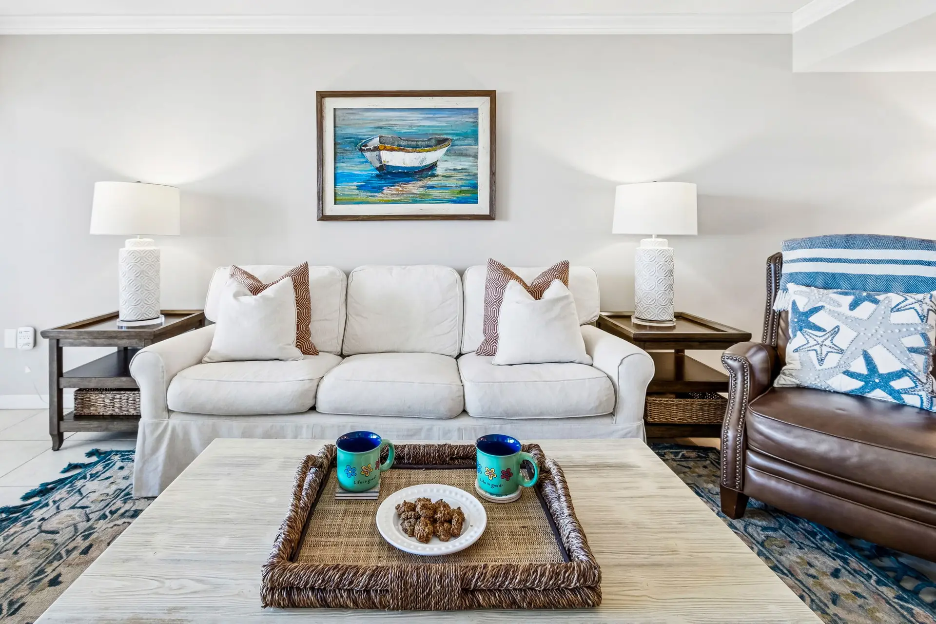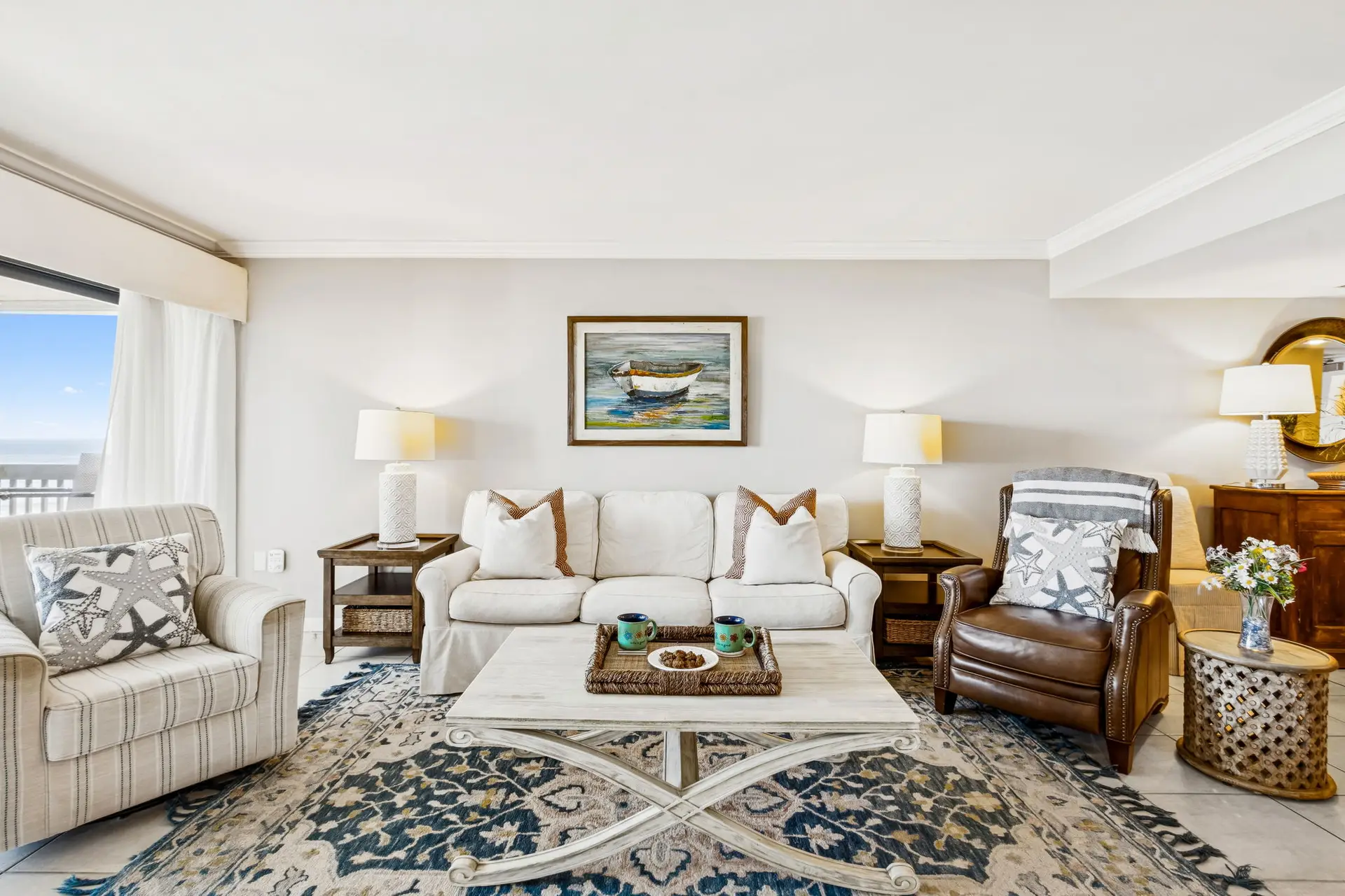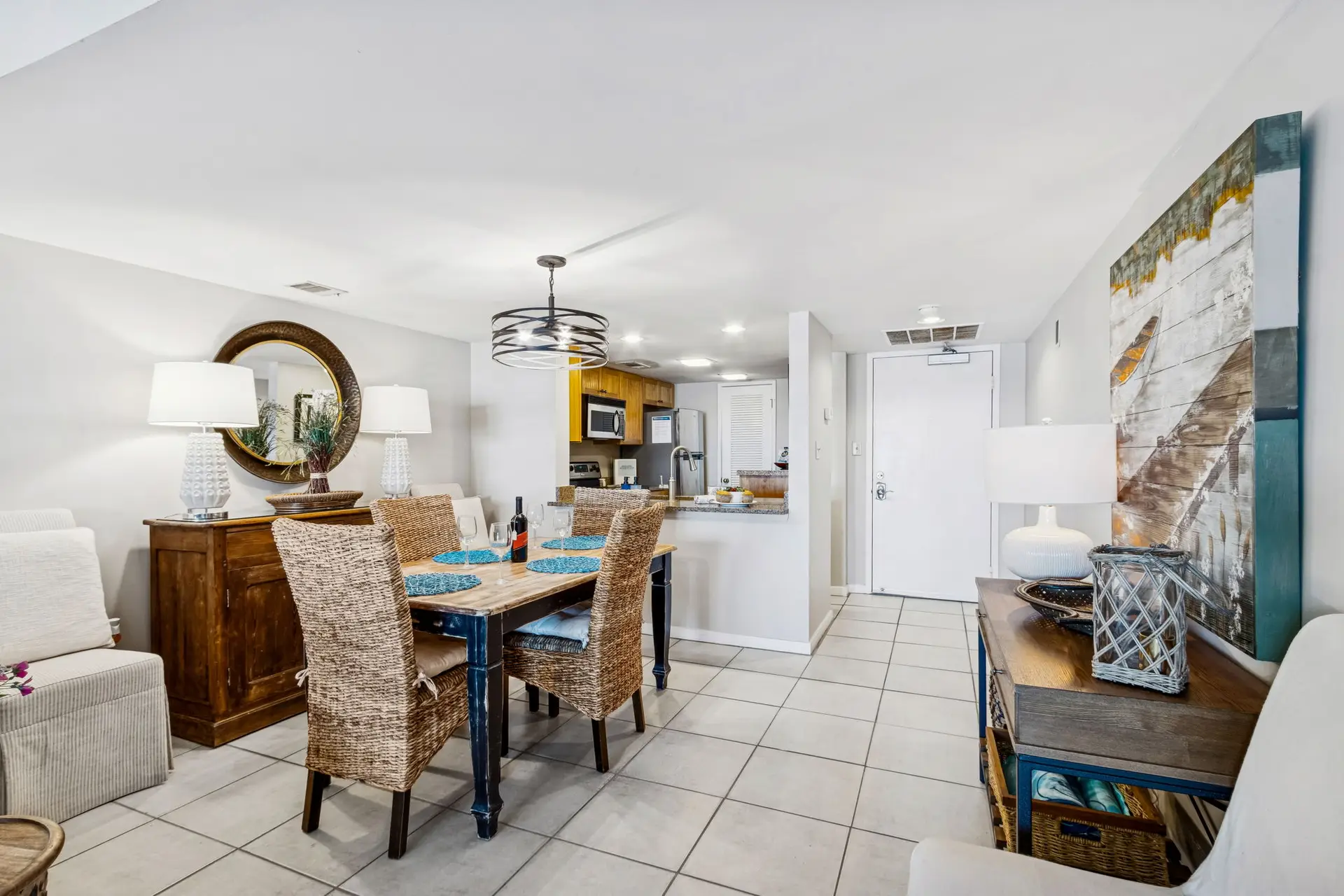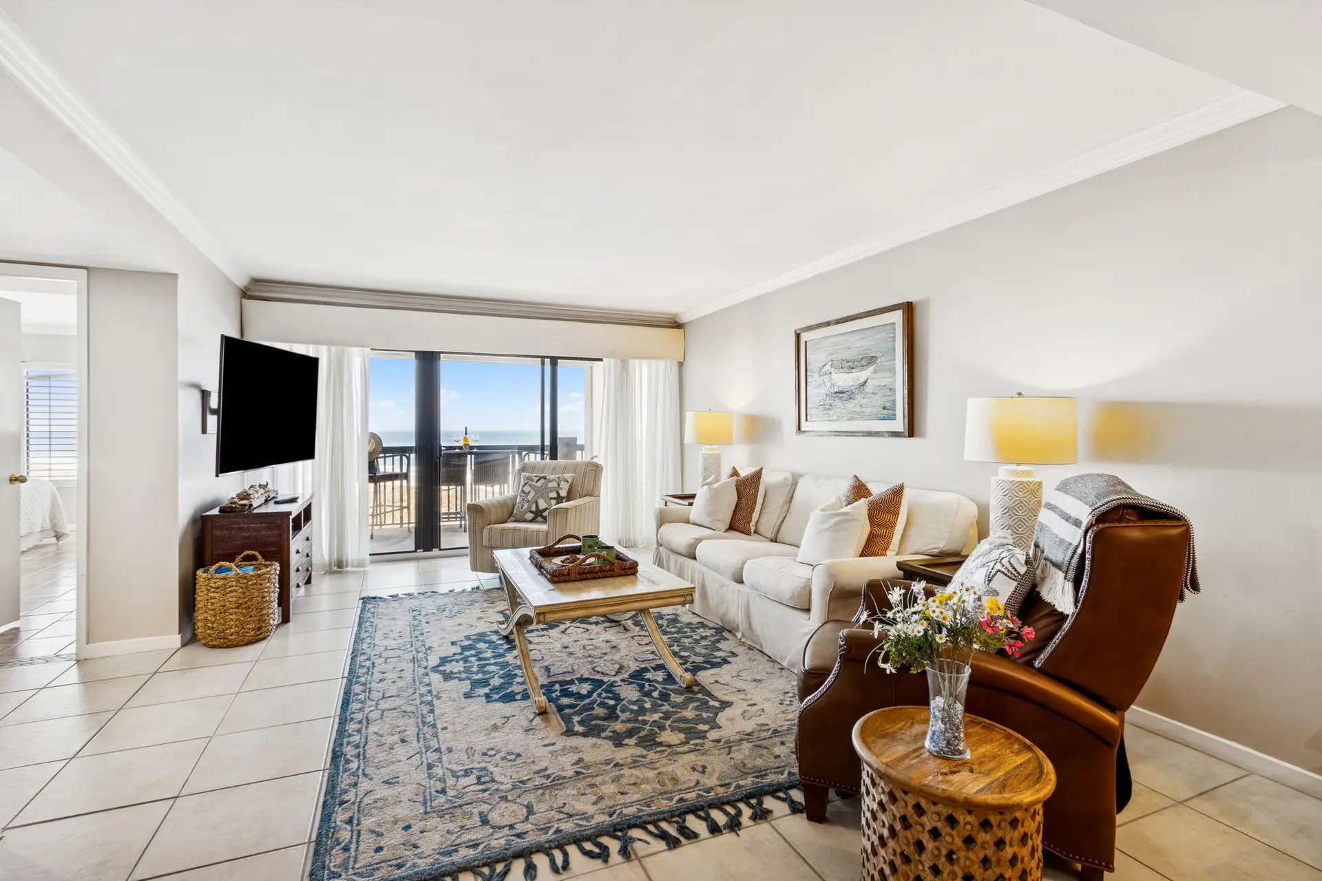 Inside, the condo combines modern comforts with a classic coastal style. The open living area has plenty of natural light and includes a pullout sofa for additional guests. Floor-to-ceiling sliders frame the ocean beyond, creating a seamless connection between the living space and balcony. A dining table sits just off the living area, while the adjacent kitchen with warm wood cabinetry comes stocked with the essentials you’ll need for your stay.