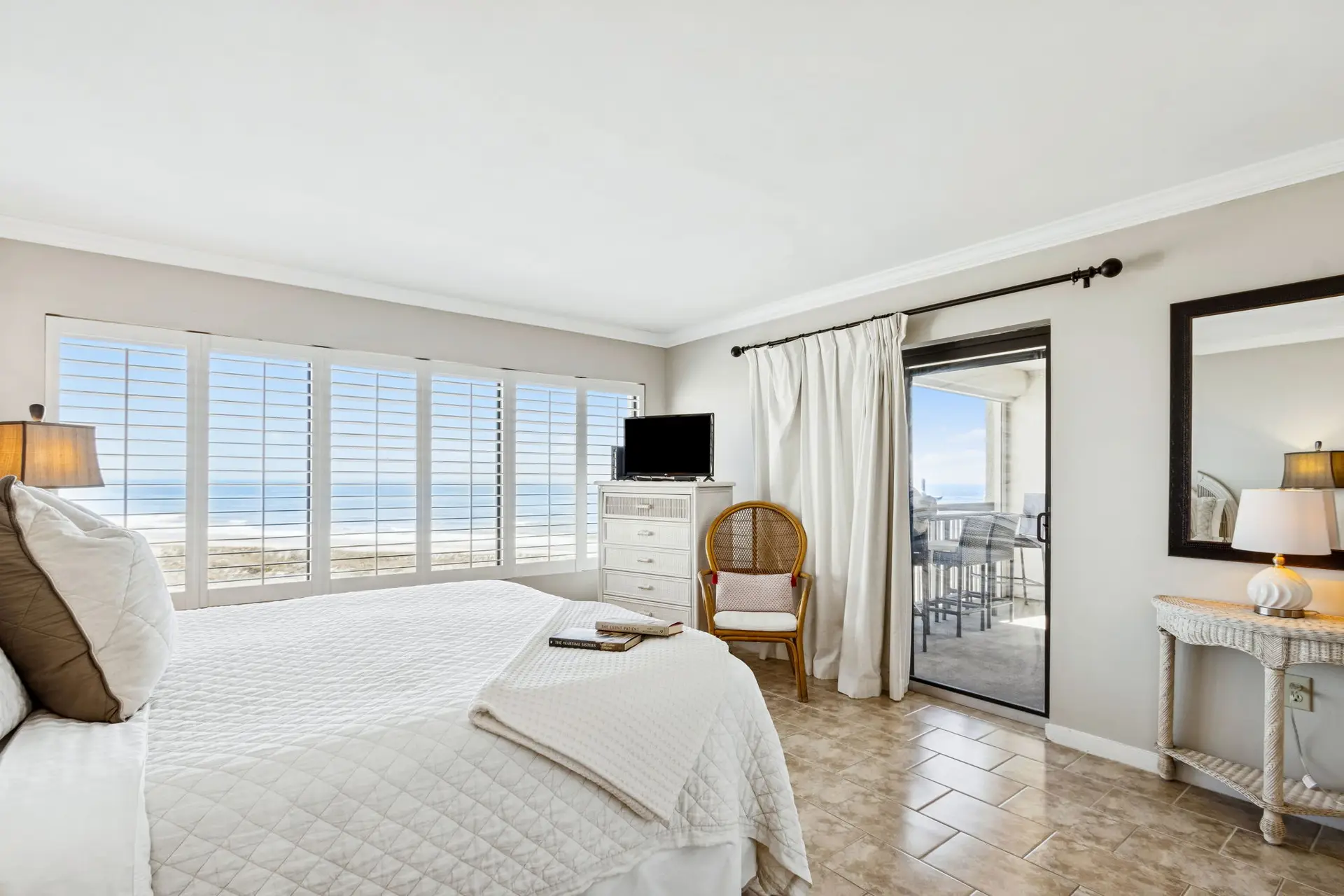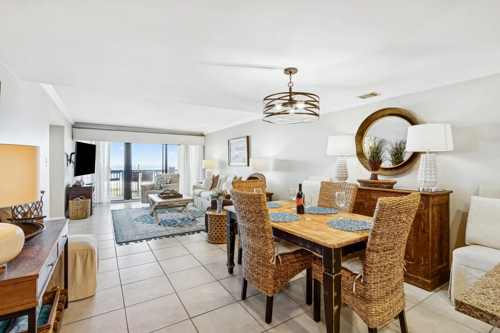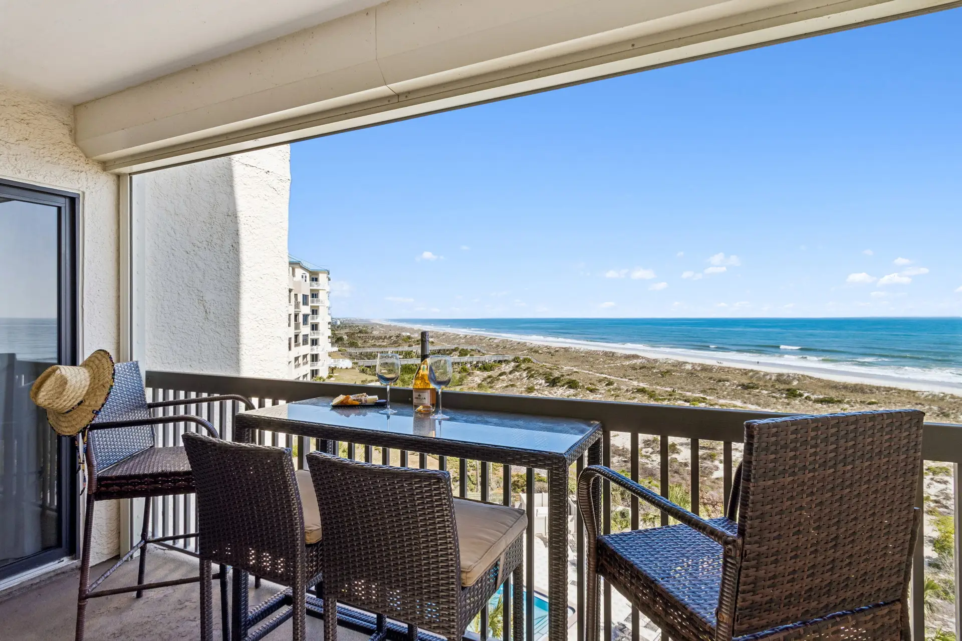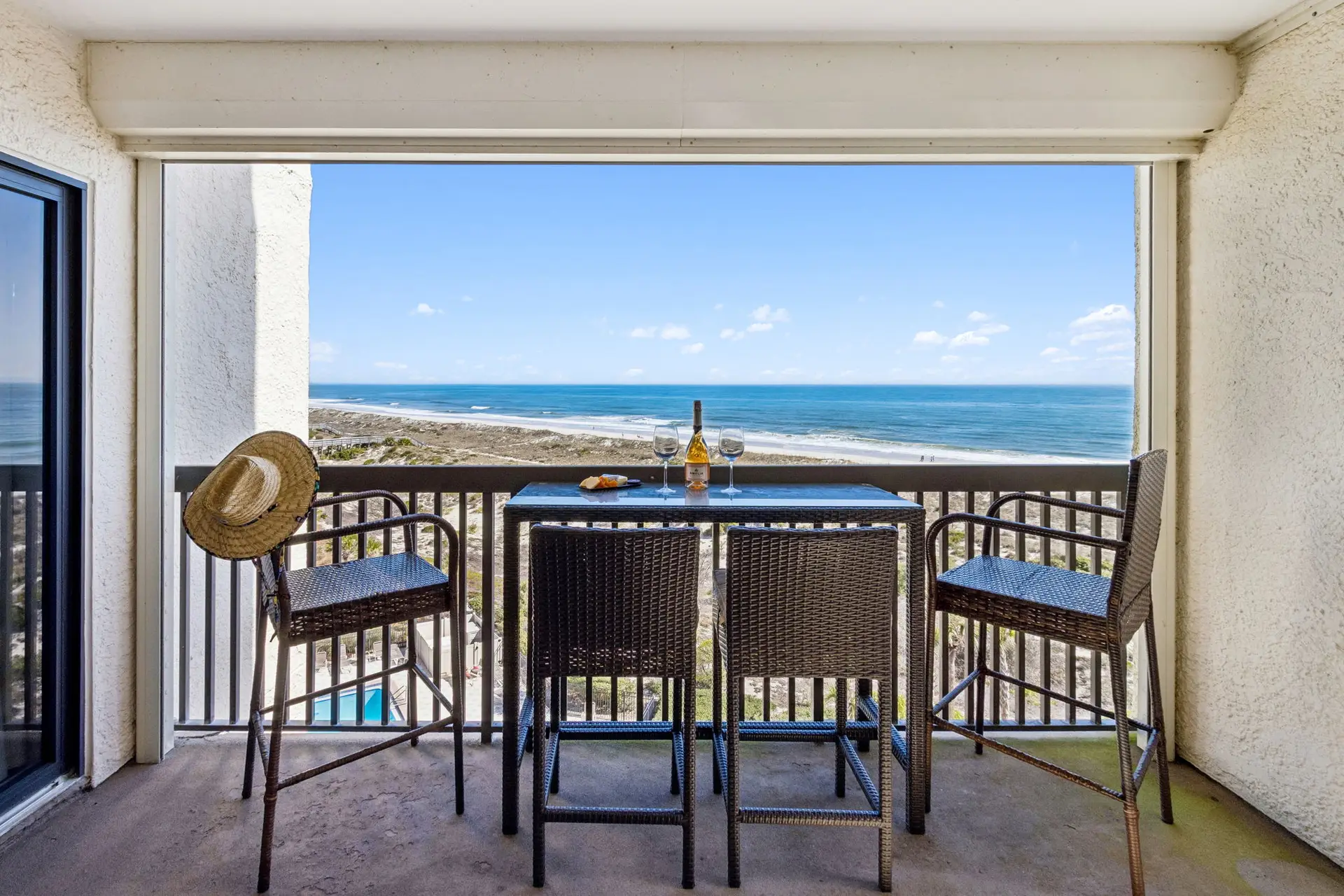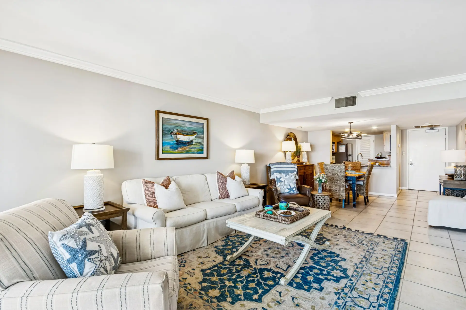 Inside, the condo combines modern comforts with a classic coastal style. The open living area has plenty of natural light and includes a pullout sofa for additional guests. Floor-to-ceiling sliders frame the ocean beyond, creating a seamless connection between the living space and balcony. A dining table sits just off the living area, while the adjacent kitchen with warm wood cabinetry comes stocked with the essentials you’ll need for your stay.