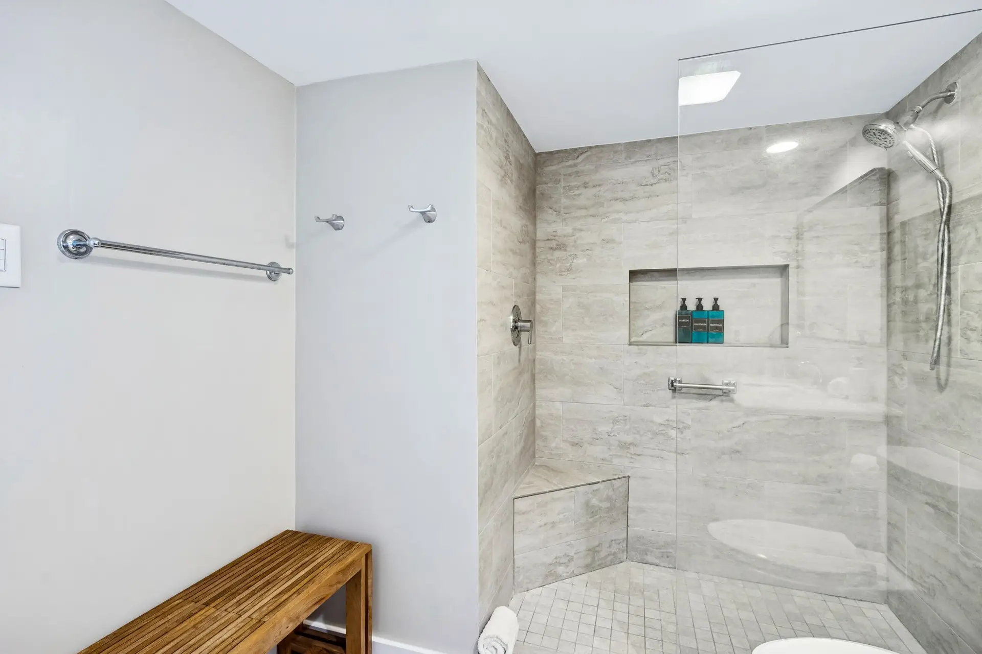 Primary Suite: King‑size bed, TV and attached bathroom with a walk‑in shower.