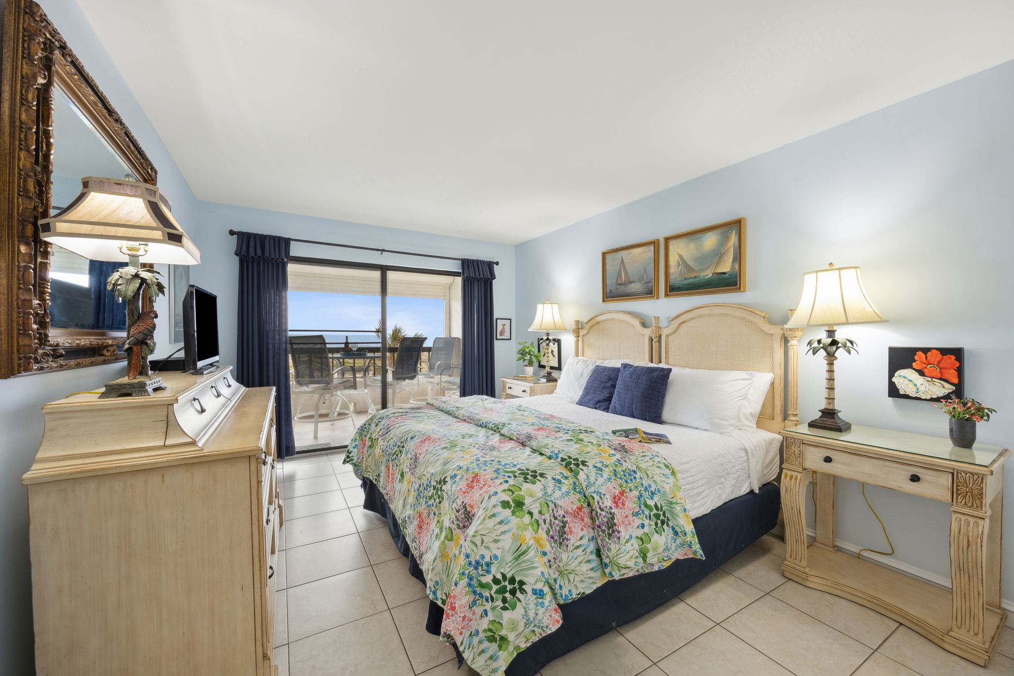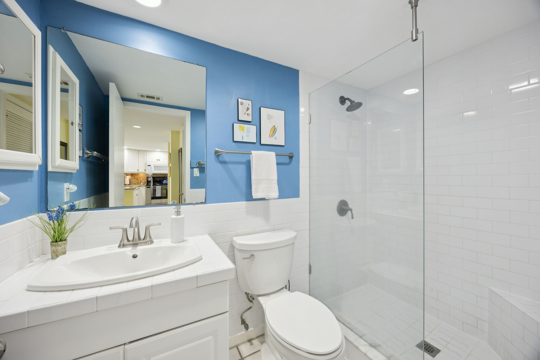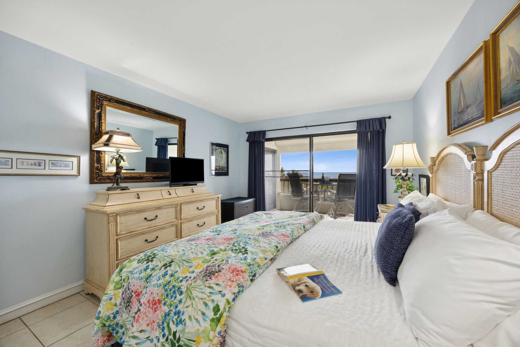 The king bedroom offers a calm and comfortable retreat with plenty of storage, direct balcony access, and ocean views. The bathroom features a clean, updated walk-in shower, perfect for rinsing off after a day at the beach.