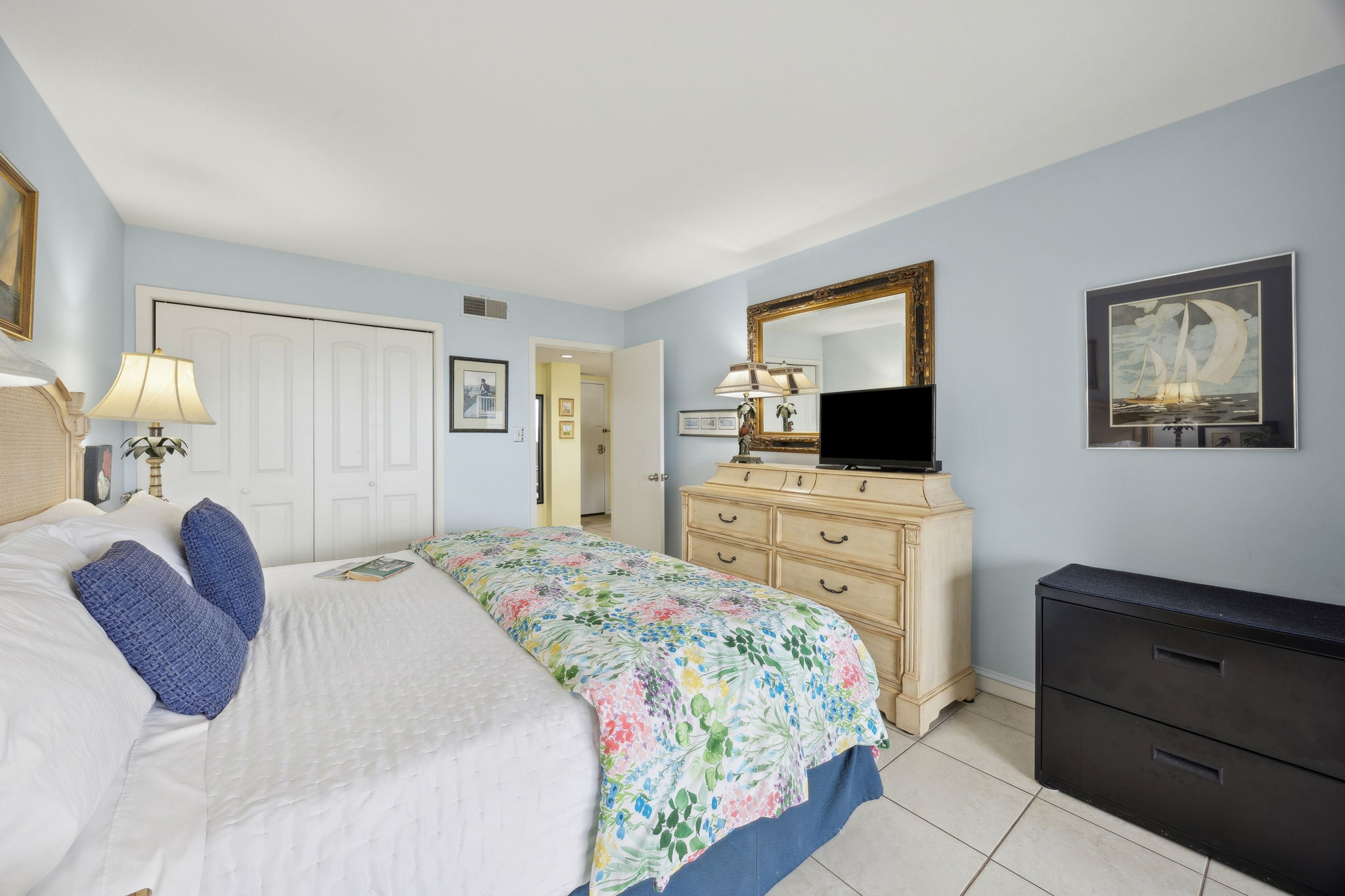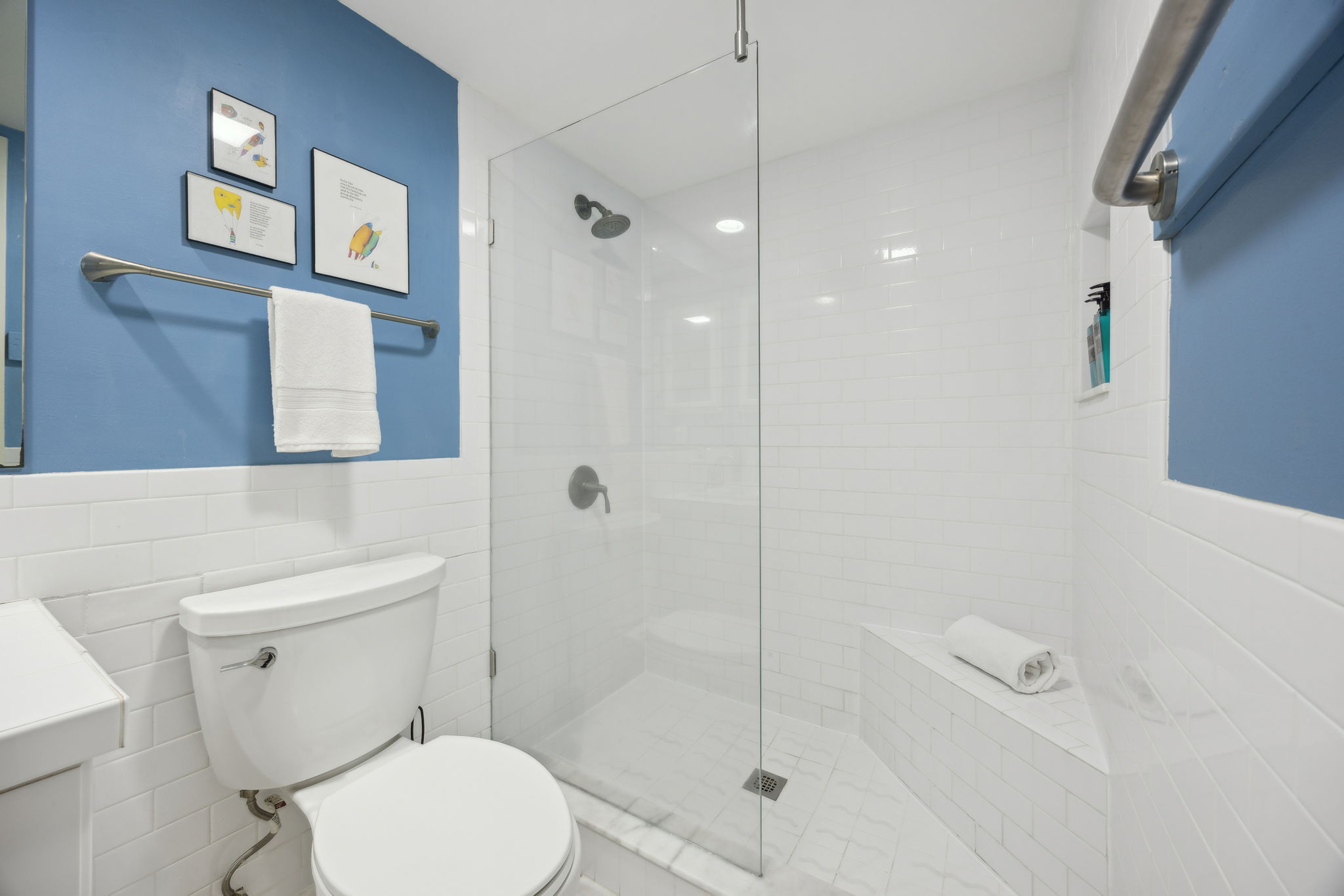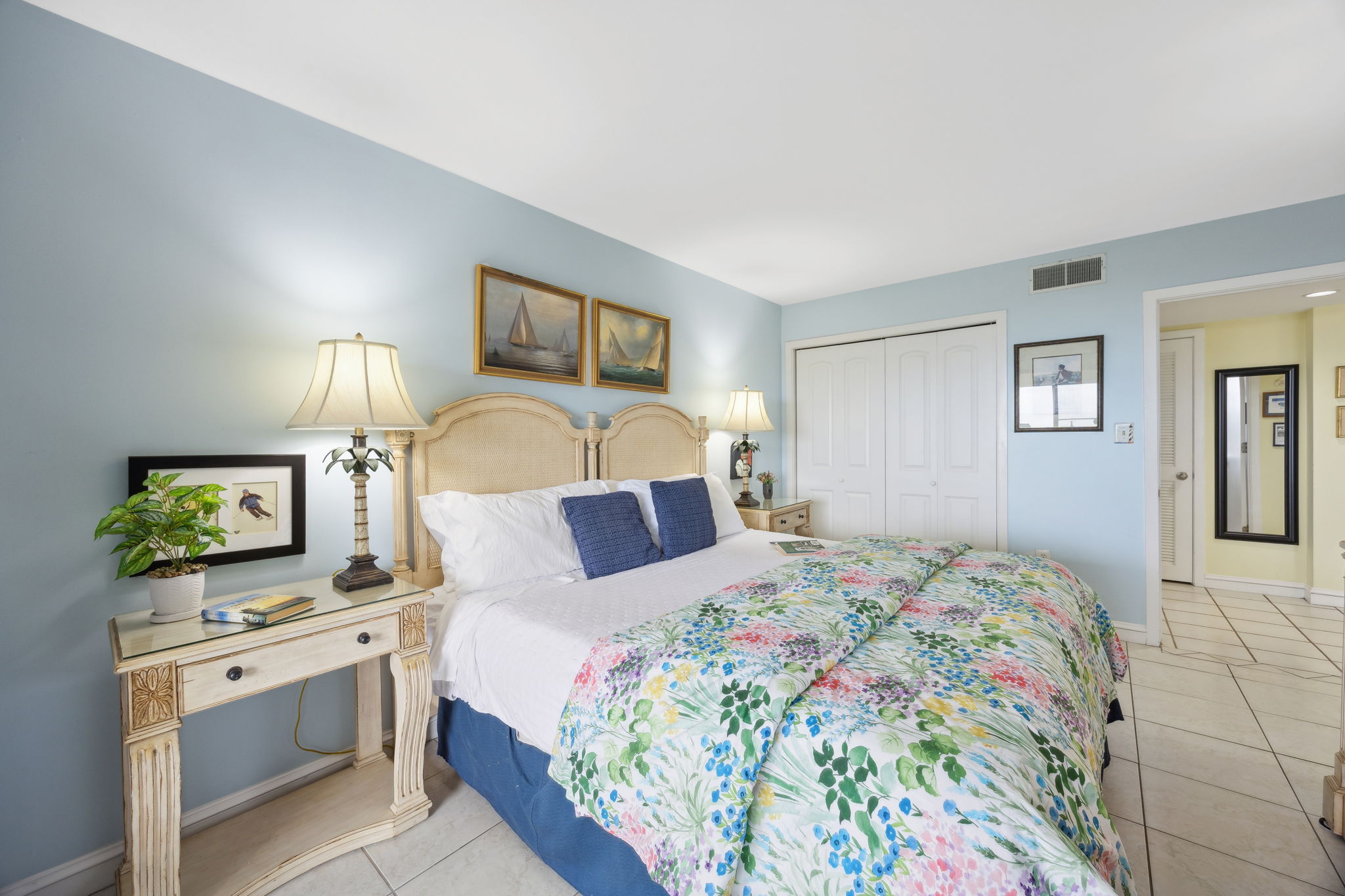 The king bedroom offers a calm and comfortable retreat with plenty of storage, direct balcony access, and ocean views. The bathroom features a clean, updated walk-in shower, perfect for rinsing off after a day at the beach.